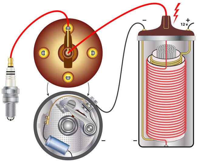 -Dans le cas de l'allumage par batterie, il peut arriver qu'un fil de la bobine soit cassé ; on s'en rend compte en vérifiant que le courant arrive bien à la bobine (en mettant à la masse le fil d'arrivée, ce qui donne des étincelles), mais il n'y a pas de production d'étincelles à la bougie. Si la bobine est bonne, il y a lieu de vérifier l'écartement des vis platinées du distributeur et de les remplacer éventuellement si leur usure est trop prononcée.